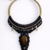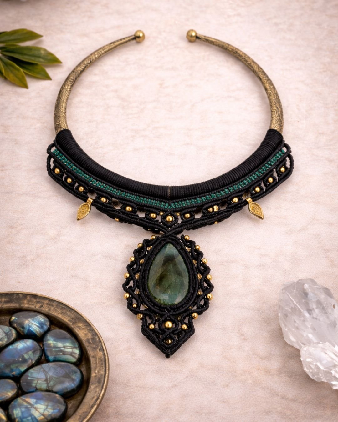 A bold yet refined silver tone brass choker featuring crafted on an engraved brass open base, wrapped in deep navy and black waxed thread and finished with a polished oval teal stone. Designed to make a strong statement while remaining comfortable and wearable.