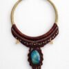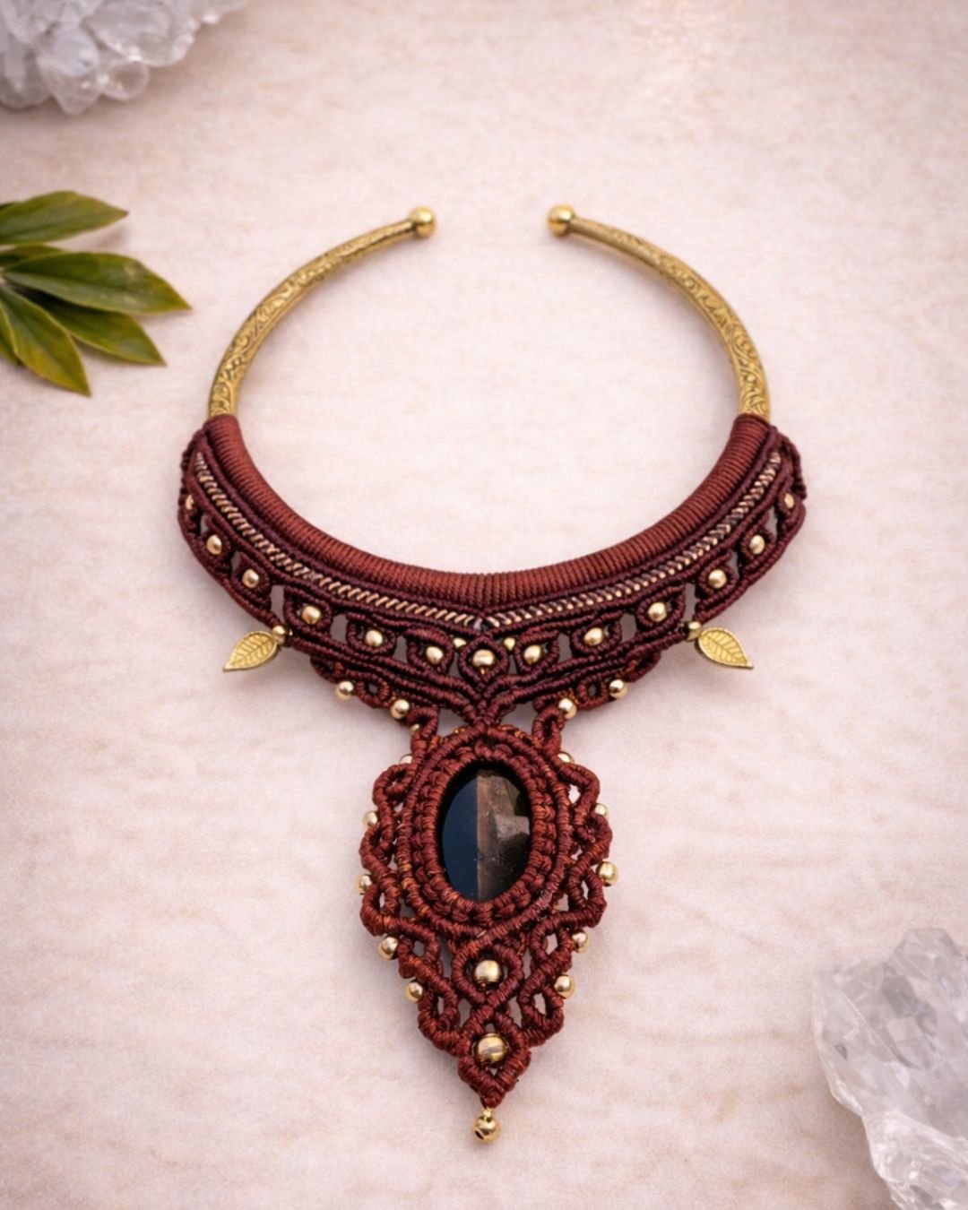 A bold yet refined silver tone brass choker featuring an engraved brass open back base, wrapped in warm rust and black waxed thread, and finished with a polished oval tiger eye stone. Designed to make a strong statement while remaining comfortable and wearable.