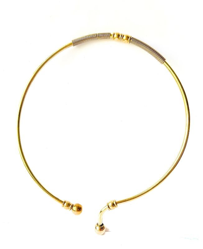 This torque necklace is skillfully crafted from premium golden brass, adorned with detailed coiled wire sections and decorative beads. Its open-ended design ensures comfort and adaptability to different neck sizes.