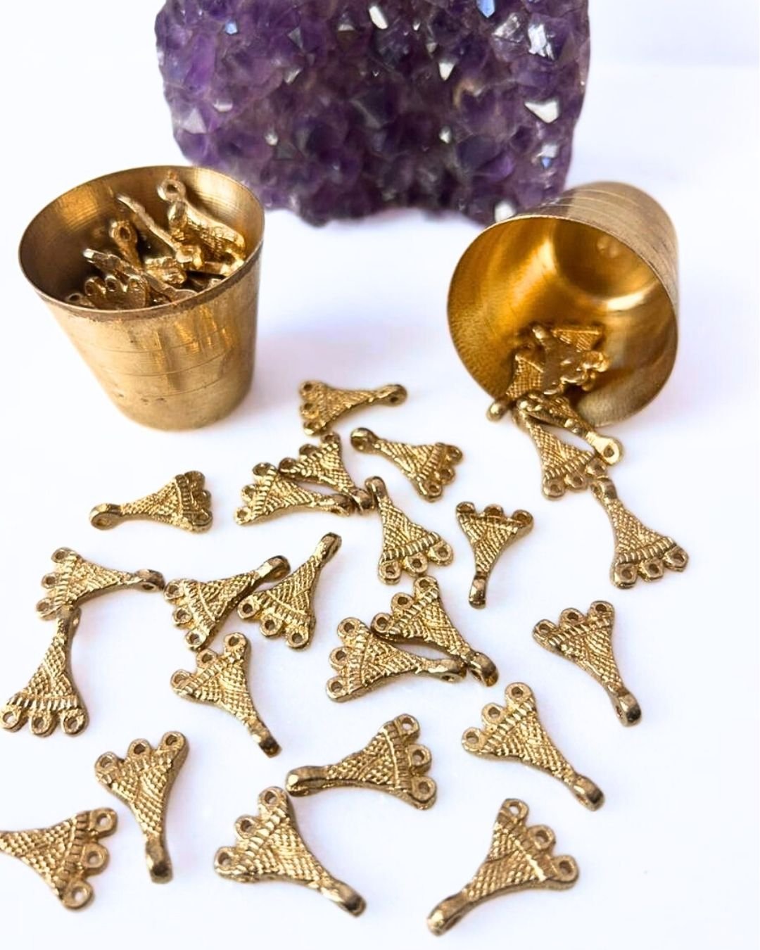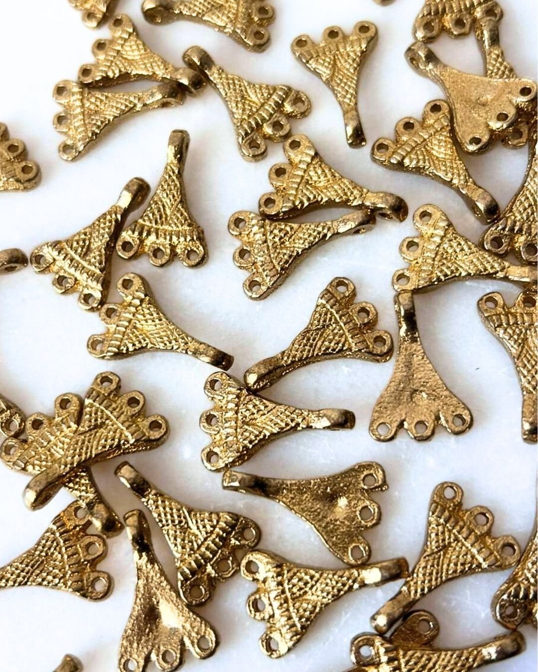 New model from our 2026 collection. Decorative brass fan shaped connector charm with three top loops and a bottom loop, perfect for jewelry making such as earrings, necklaces, and boho or tribal designs.