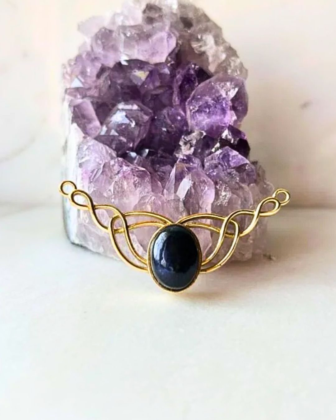 This decorative brass connector features an organic twisted-wire design that flows around a polished oval green onyx cabochon. The rich green tone of the stone contrasts beautifully with the warm brass finish, creating a balanced piece that feels both elegant and earthy.